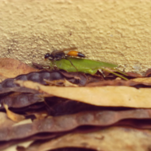 Esta vespa está a carregar a comida para as crias. Pelo que sei, a vespa irá esconder/enterrar o gafanhoto (que penso estar apenas paralizado) e depositar o seu ovo nele ou dentro dele. Depois quando o ovo eclodir, a vespa bébé vai alimentar-se do gafanhoto =)