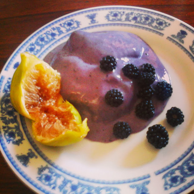 Preparei o gelado depois do almoço e nem durou 5 mins. Estava uma delícia. E simples, apenas levou banana, amoras e um pouco de "leite" de soja. Sem açúcar adicionado.