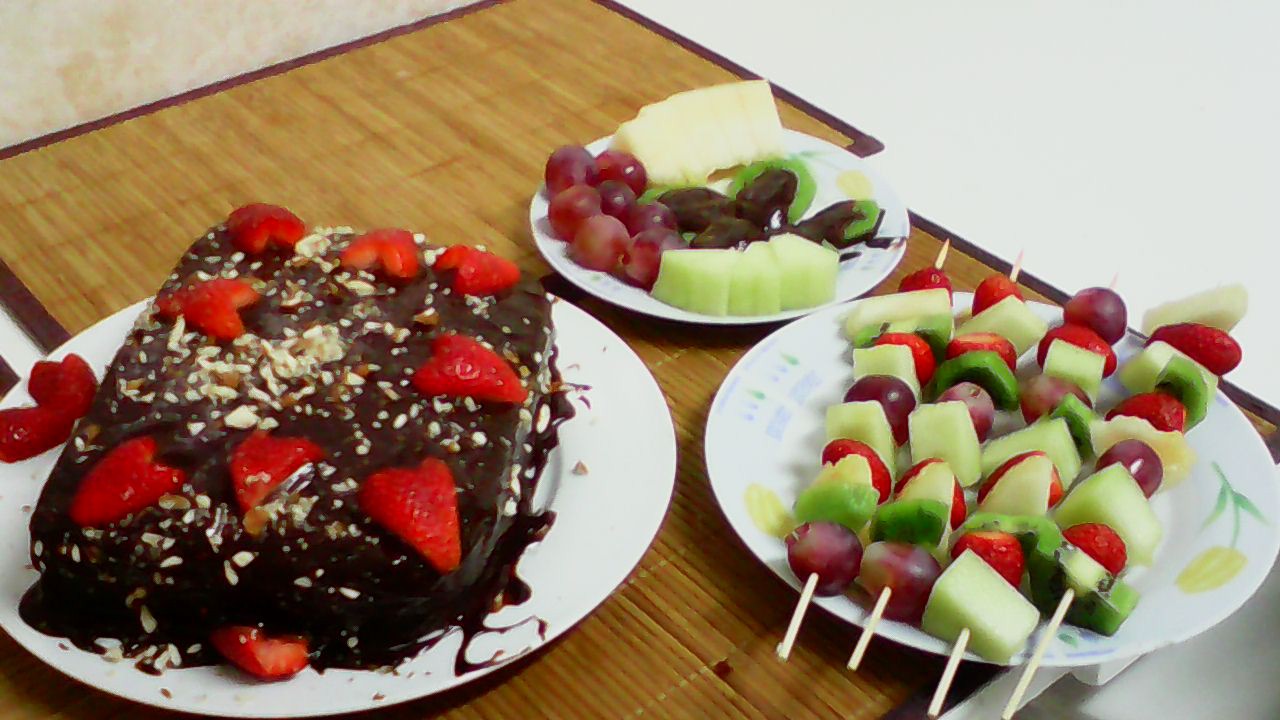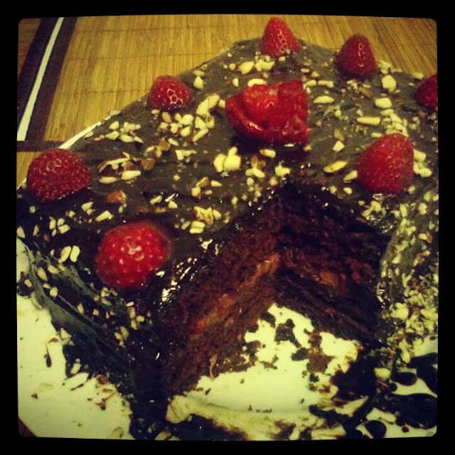 Bolo de chocolate com recheio de morando e cobertura de amendoa, morango e chocolate.