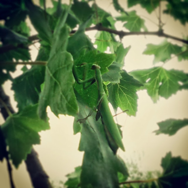 Hoje, depois do almoço, reparo que tinha alguém a olhar para mim... quando olho para o lado lá estava este tipo (digo tipo porque o animal não tentou comer-me a cabeça...) olhar para mim com aqueles olhos enormes e a mexer as patas como os louva-a-deus fazem. Foi giro até ao momento em que parece que ele sentiu que estava a surgir algo entre nós e resolveu se aproximar... se calhar para dar um abraço, não sei... só sei que subiu para o cabelo e dali consegui mete-lo numa videira que estava perto.
